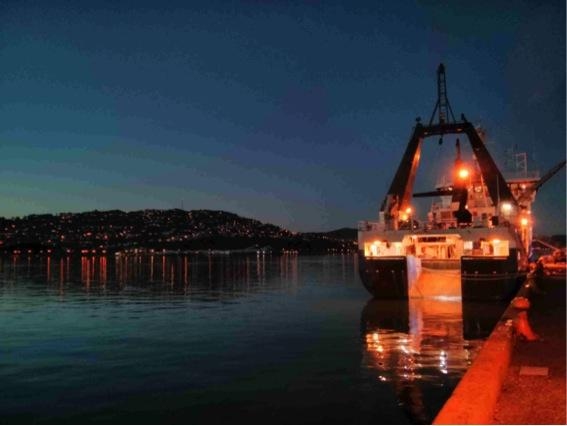 The NIWA research vessel Tangaroa in port in Wellington the evening before sailing for the survey.