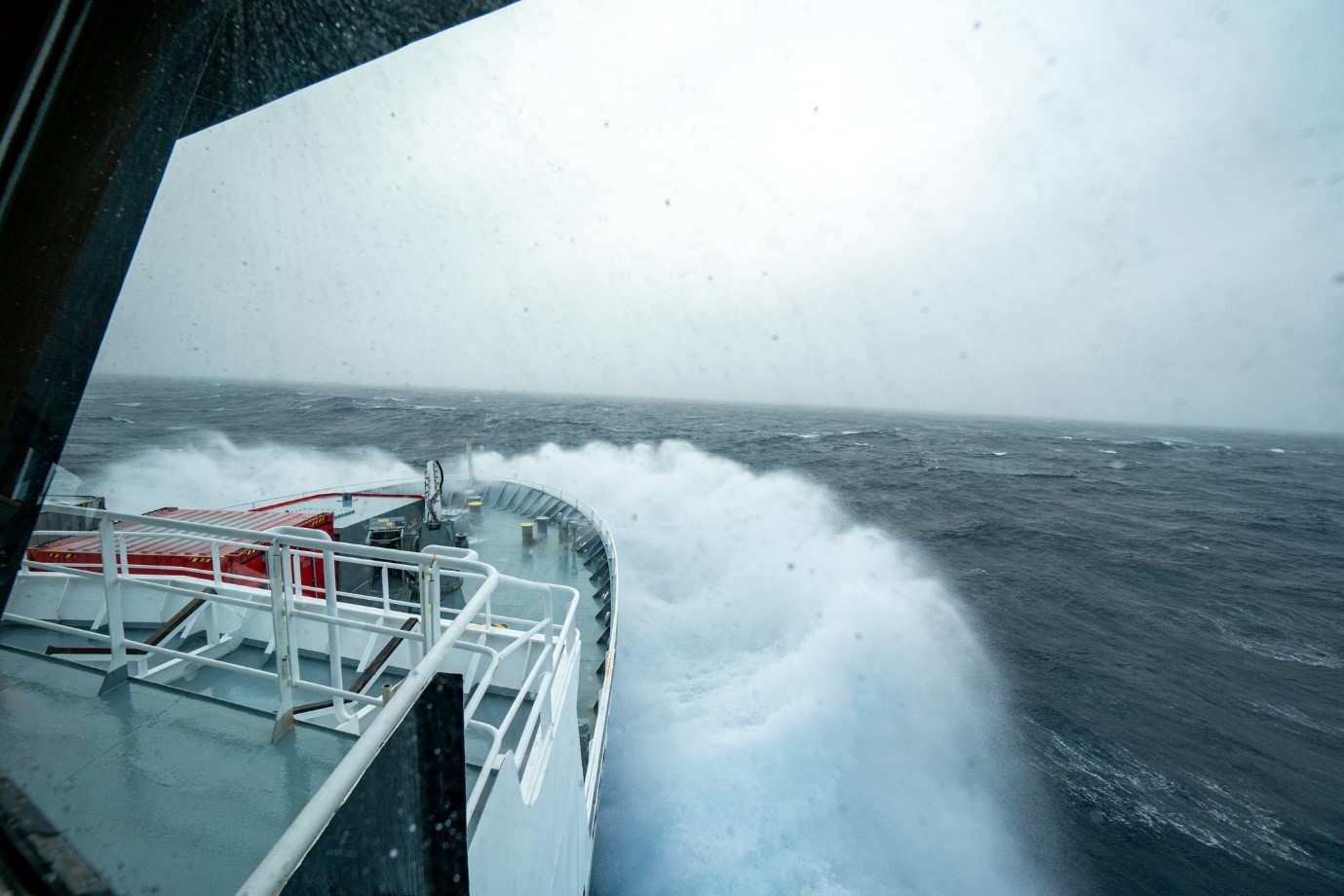 RV Tangaroa ploughing through a 6m swell on her way back from the Ross Sea.