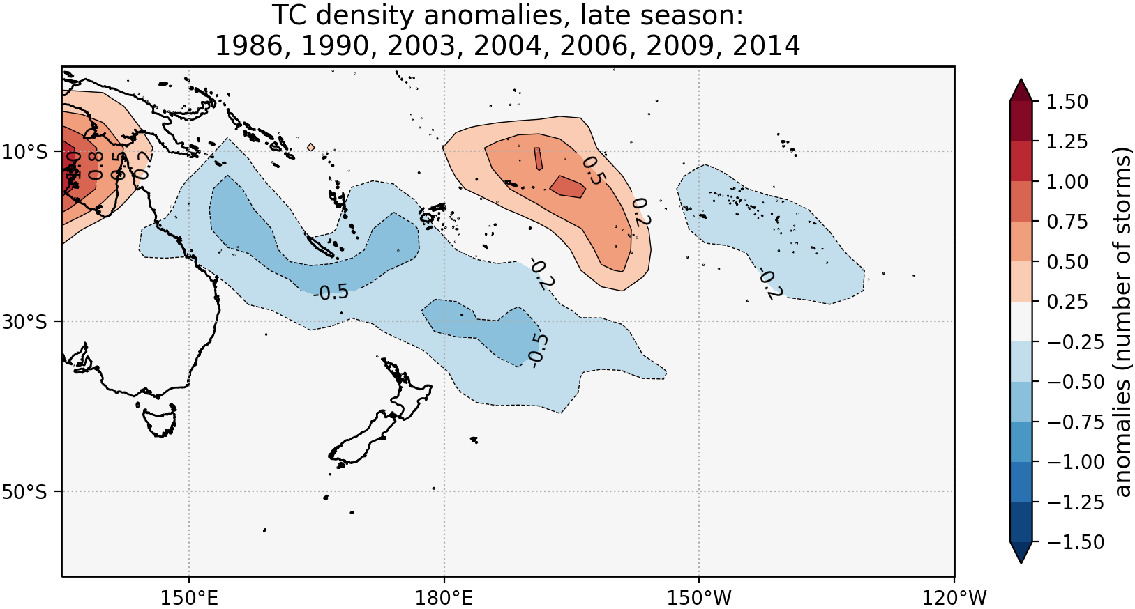 TC density anomalies, late season for years:1986, 1990, 2003, 2004, 2006, 2009, 2014