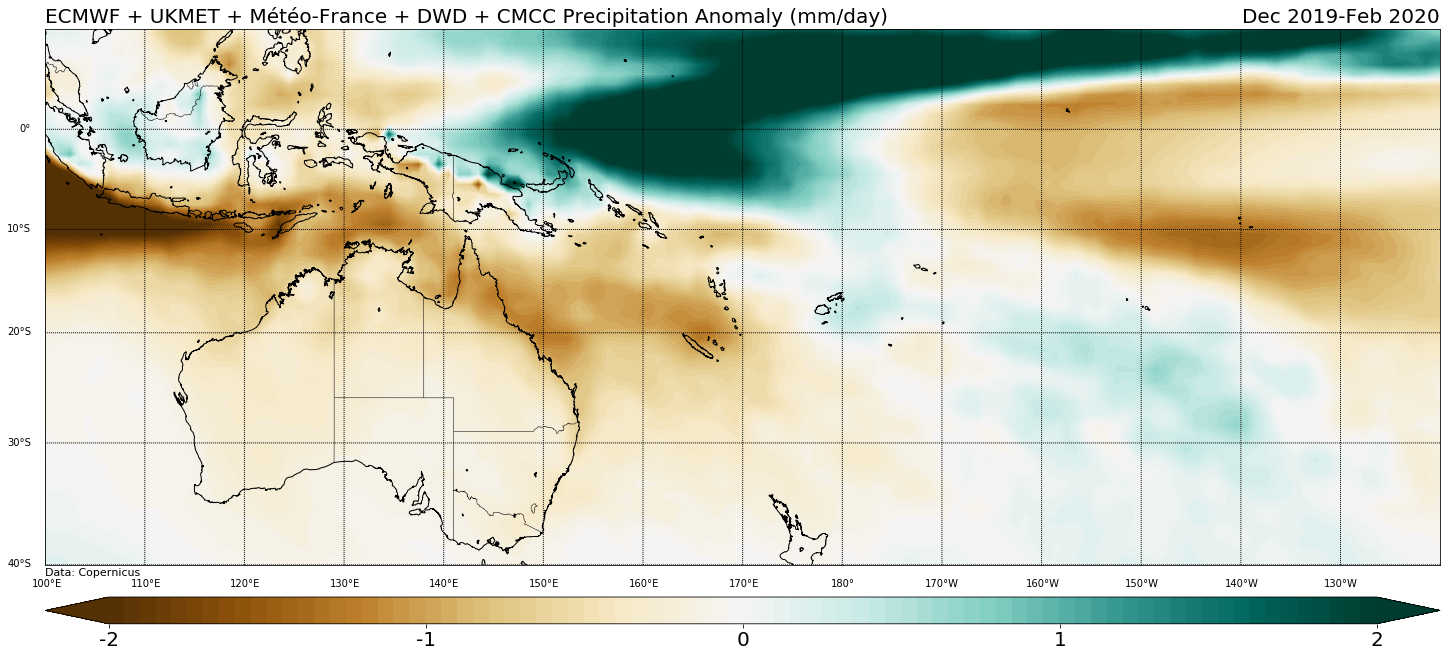 Figure 6. Multi-model ensemble forecast rainfall anomaly (mm/day), December 2019-February 2020; green (brown) shades indicate above (below) normal forecast rainfall.