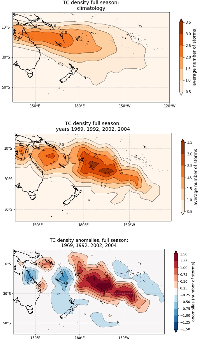 Figure 2: Number of TCs occurring for the main development season (November – April) in the Southwest Pacific (135°E to 120°W): (top panel) average number during 1981 to 2010 (normal); (centre panel) average number over selected four analogue seasons (Table 1); (bottom panel) departure from normal for the analogue seasons (difference between count in centre and top panels). For each year noted, that represents the start of the main development season (i.e. 1969 = November 1969-April 1970).