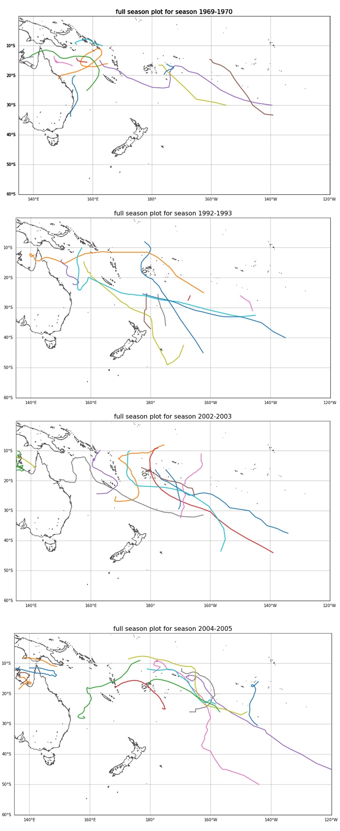 Figure 3: Plots of TC tracks and major storms that were monitored for analogue seasons used in the 2019/20 seasonal forecast for the full season (November - April). Track data are courtesy of International Best Tracks Archive for Climate Stewardship (IBTRACS).