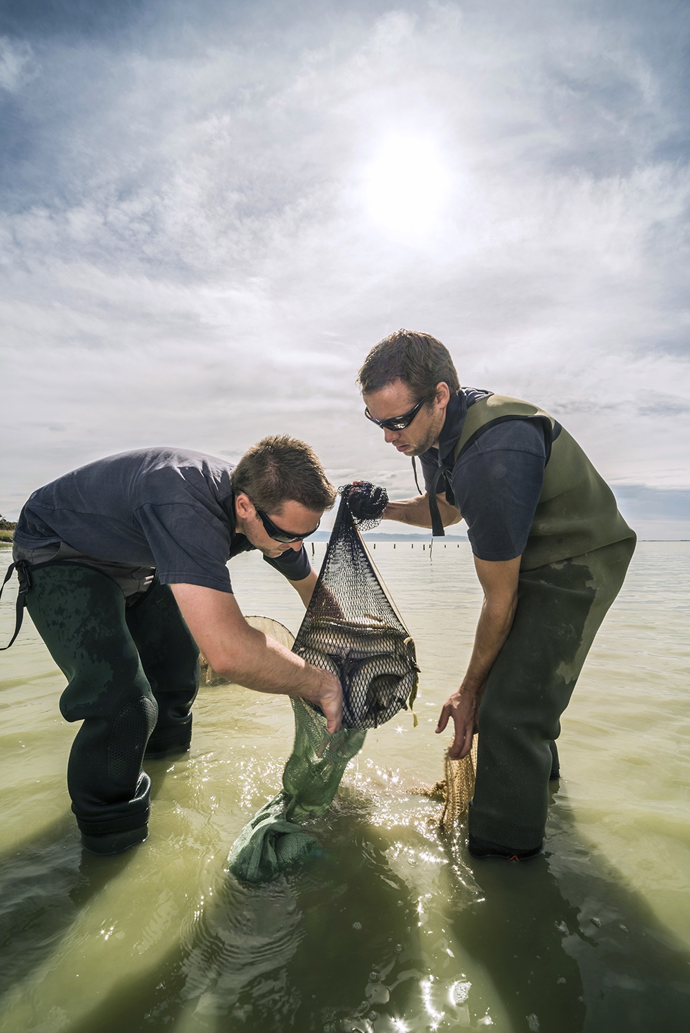 Dr. Shannan Crow (left) and Dr. Phil Jellyman (right) collecting catches of longfin and shortfin eels in Te Waihora (Lake Ellesmere). This eel study is part of a multi-disciplinary research programme that is monitoring the benefits of macrophyte re-establishment in Te Waihora. Photograph by Dave Allen.