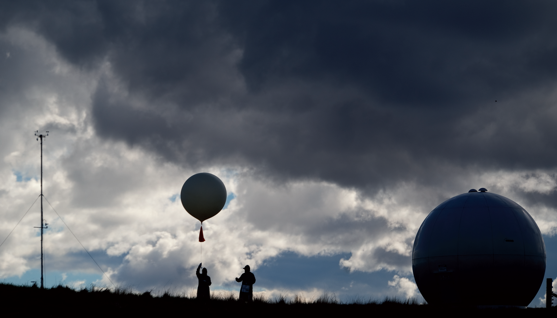 Technicians release a balloon at Lauder. Chemical sensors attached will measure the vertical ozone profile up to an altitude of around 35 kilometres before descending.