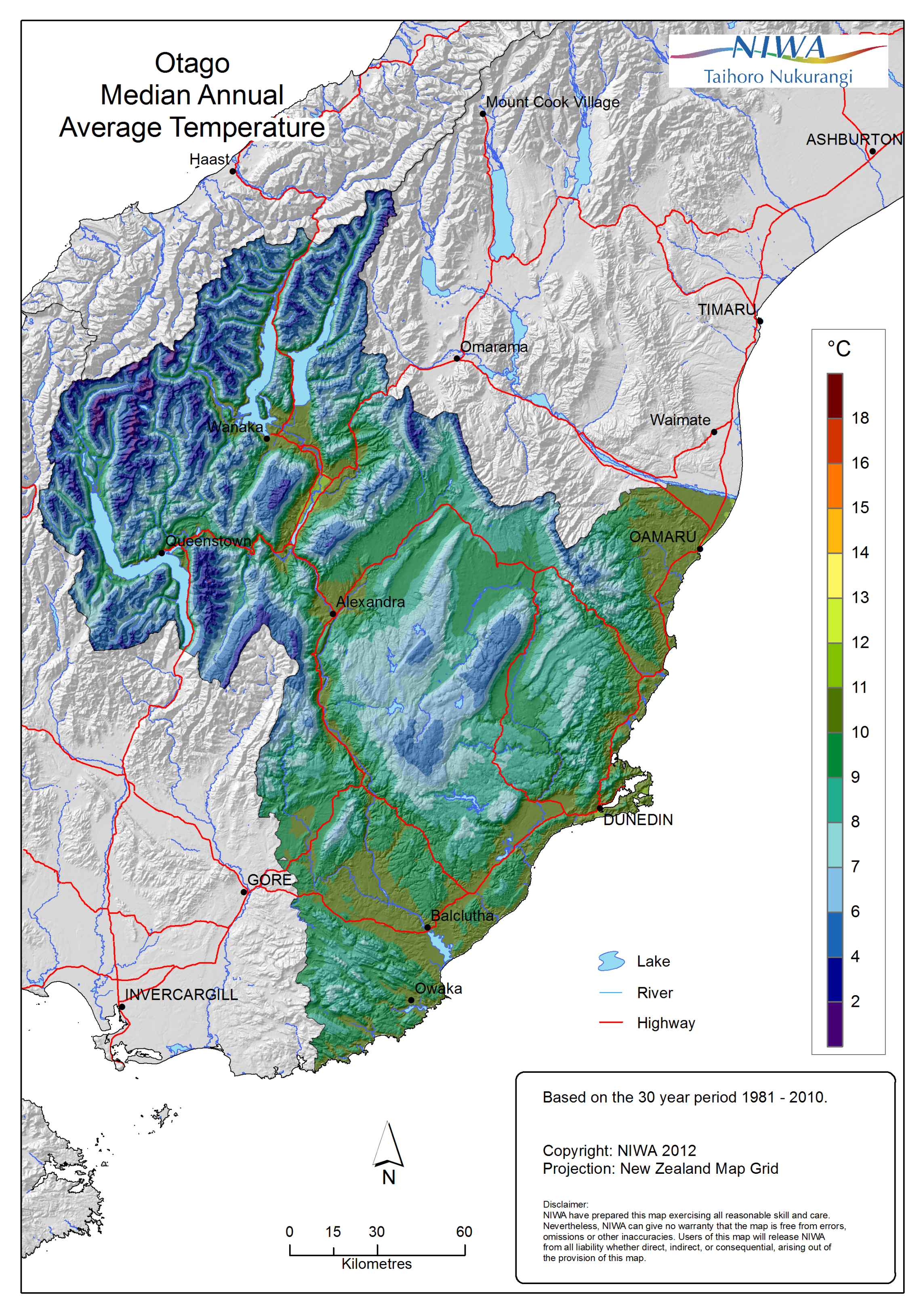 Otago - Median annual average temperature