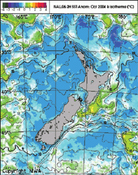 Temperatures of seas adjacent to New Zealand have been trending slowly downwards over recent months.