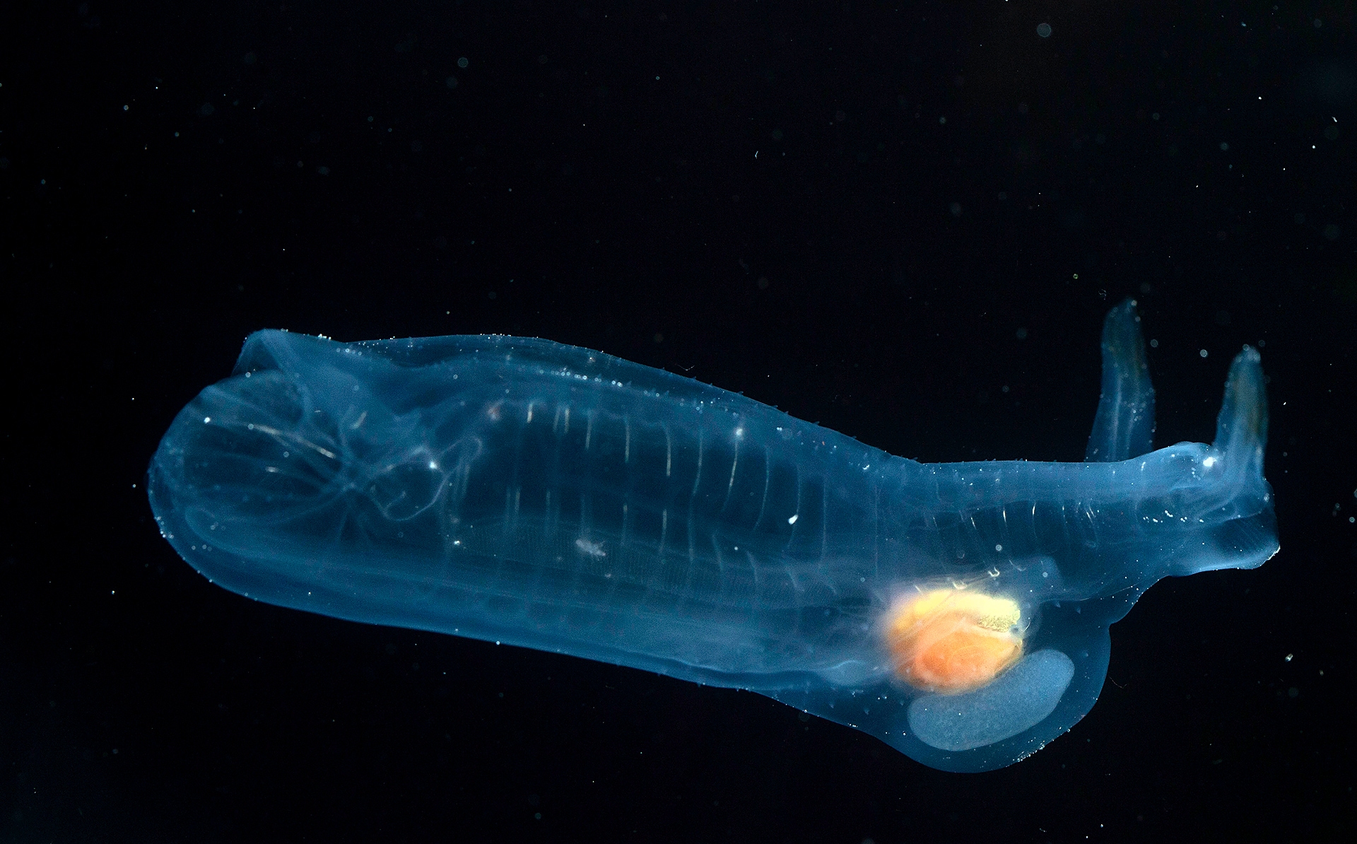 T. vagina oozooid. You can see the muscle bands that allow these animals to pump large amounts of water through their bodies very clearly. To the left is the oral siphon (similar to the mouth), where water enters, and to the right, near the end, is the atrial siphon, where water comes out.