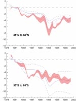 Time series of total column ozone variations from observations and from eight 2-D models for the northern and southern mid-latitudes.