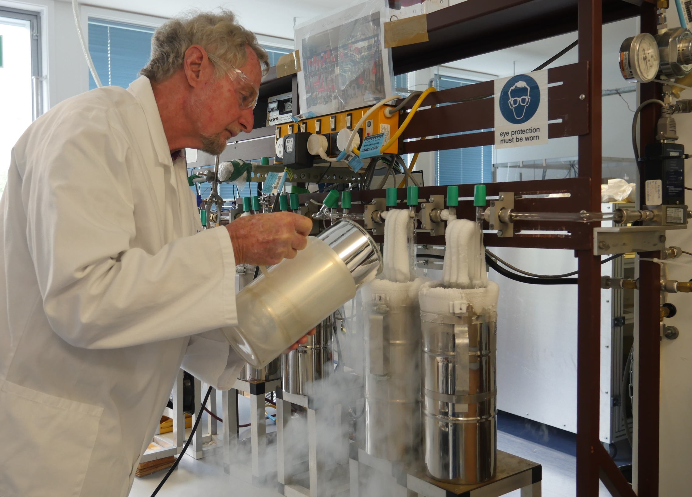 Tony Bromely prepares ice core samples to extract and record miniscule methane amounts trapped within their icy air bubbles.