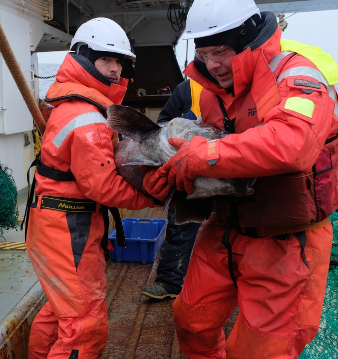 NIWA scientist Pablo Escobar-Flores (left) and Tangaroa crewman Phil Bignell (right) carry a large toothfish before releasing it.