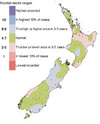 Total rainfalls for 1 January to 30 June 2002, shown according to decile rankings of all rainfalls for this period from 1972. Dots indicate observation sites used in the analysis.