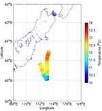 The track of the ship over the last 36 hours. The colour indicates the temperature of the sea surface water. (Photo: Edward Abraham)