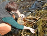 Tracy examines coralline algae growing on kelp in the Chatham Islands. (Photo: K. Neill)
