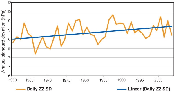 Trend in the annual standard deviation of the daily Z2 index (Christchurch minus Campbell Island pressure difference) for the period 1960-2003.