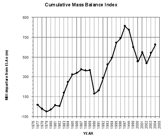 Trends upwards represent growth in glacier ice mass and downwards loss in ice mass.