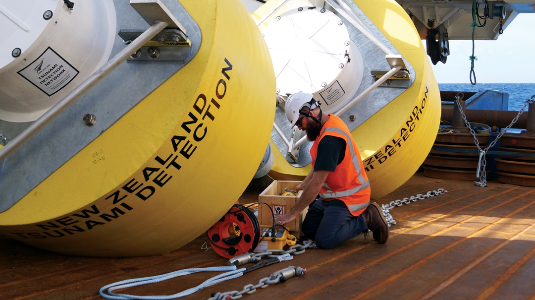 Engineer Dan Renfroe completes final data tests as the first detection buoys are readied for deployment in the waters above the Kermadec trench.