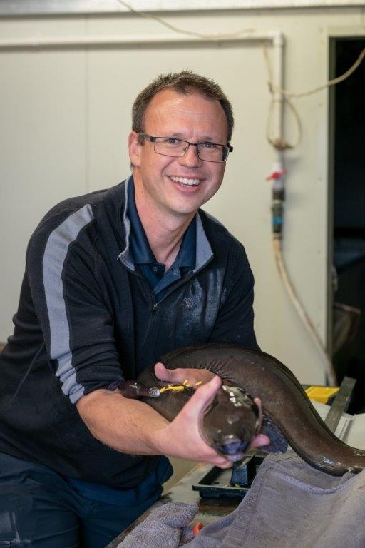 NIWA freshwater ecologist Dr Paul Franklin tagging a long-fin eel.