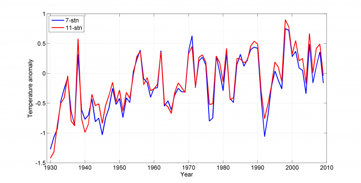 Two New Zealand temperature series compared. The warmer and cooler periods clearly do coincide, despite the fact they use separate data-sets and only one (the seven-station series) uses adjusted data.
