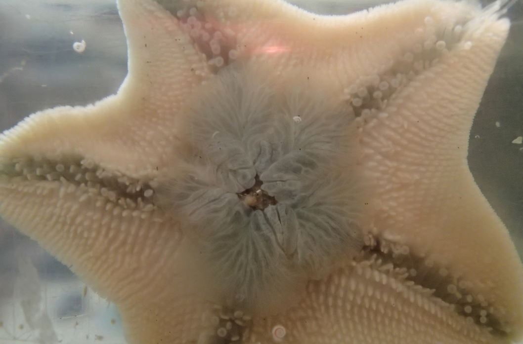 A close up of the closely related common cushion star (Patiriella regularis) extruding its stomach against the wall of an aquarium.