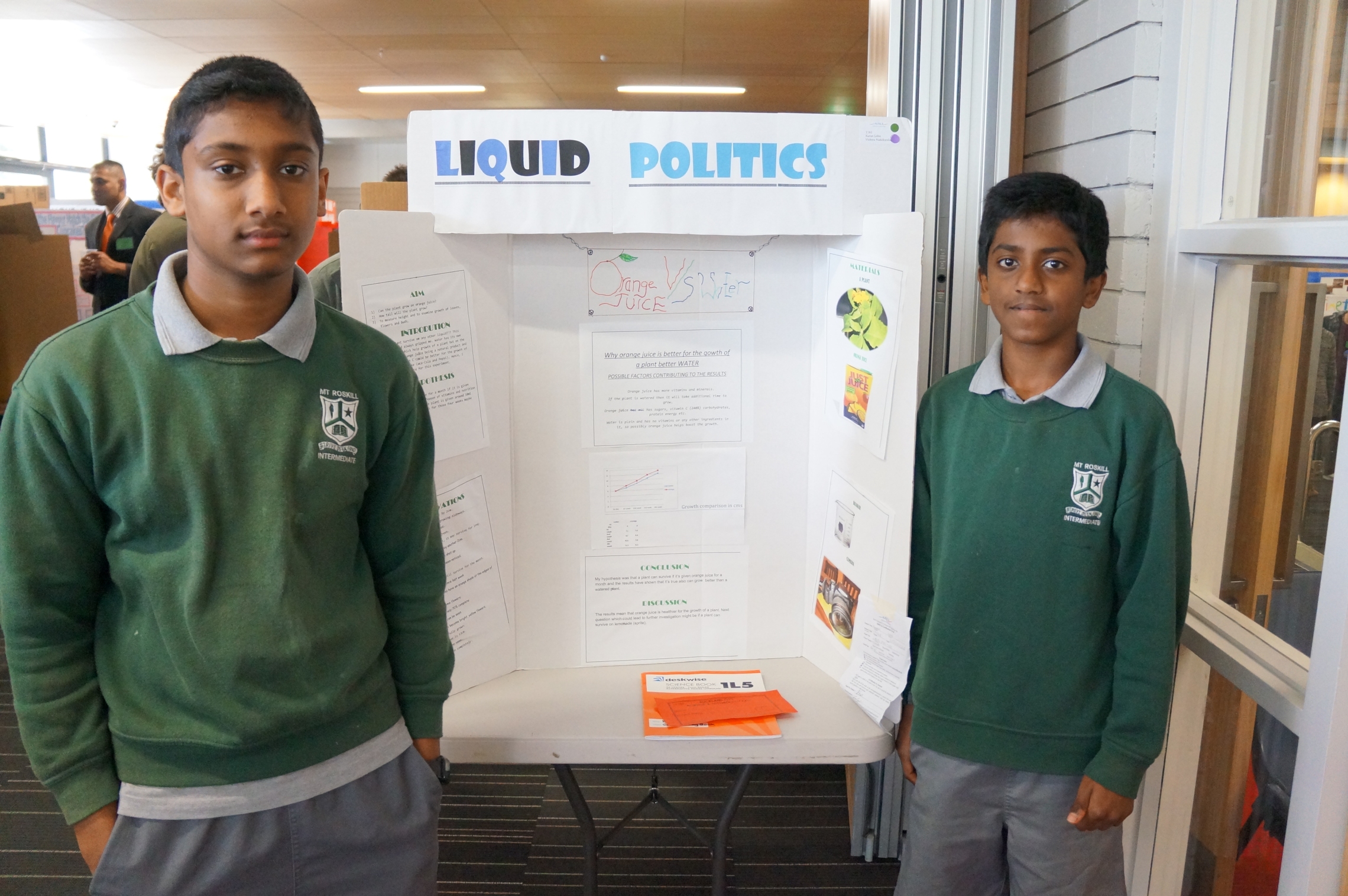 Vishwa Nadakandage and Karan Lobo and their project: Liquid Politic. Vishwa and Karan tested is orange juice or water better for growing plants? They found orange juice is better.