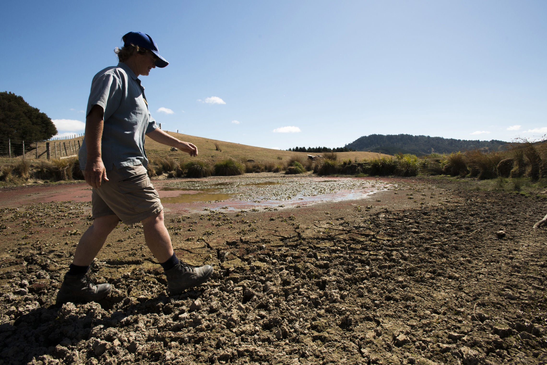 Angela Hunt crossing a dry dam which is normally used to supply stock with drinking water on Peter Gaskin's farm - Masterton Castlepoint Road, Wairarapa. Photograph taken by Dave Allen on 28 Feb 2013.