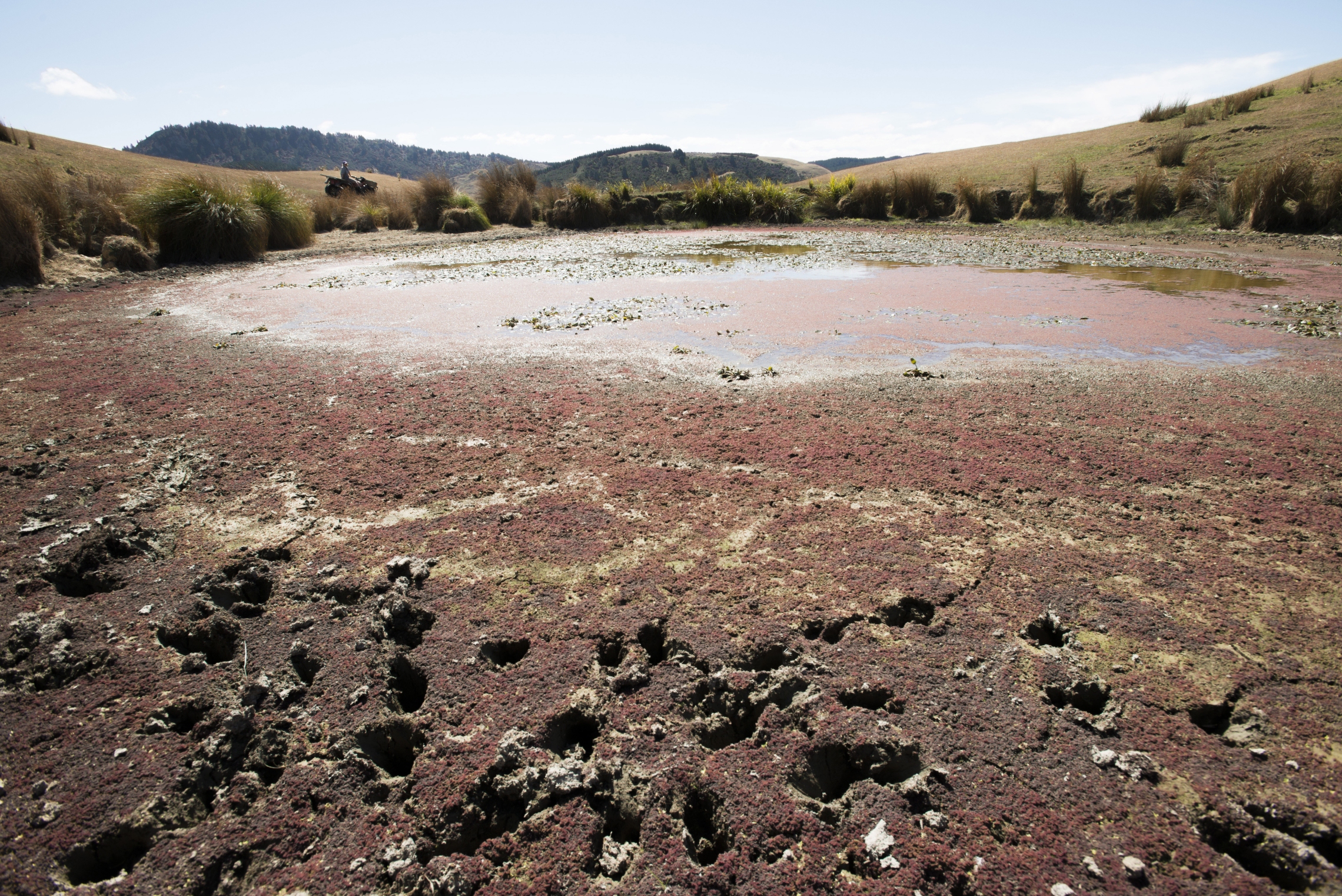 A dam which is normally used to supply stock with drinking water on Peter Gaskin's farm - Masterton Castlepoint Road, Wairarapa. Photograph taken by Dave Allen on 28 Feb 2013.