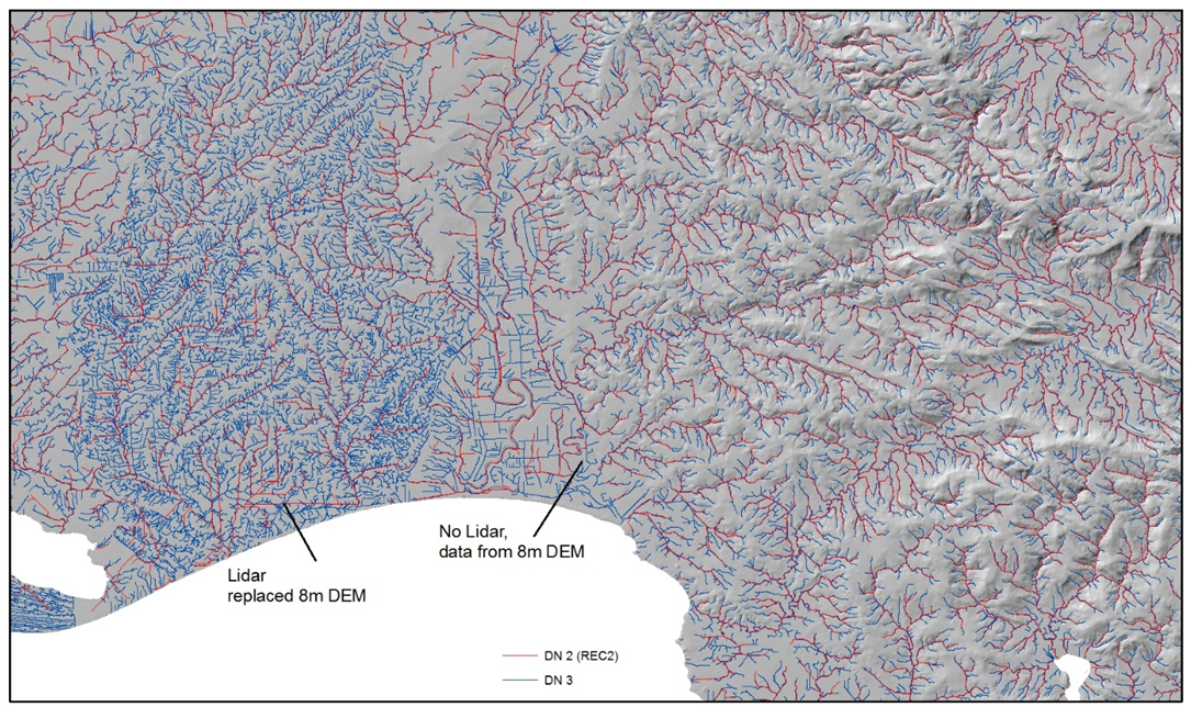 This maps shows a comparison of the existing REC-DN 2 (red) and new REC-DN 3 (blue) digital stream networks for the Waituna catchment in Southland. LiDaR information has significantly improved the spatial definition of the network. [Source: NIWA]