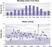 Water clarity and monthly mean river flow for the Ohinemuri River, Coromandel