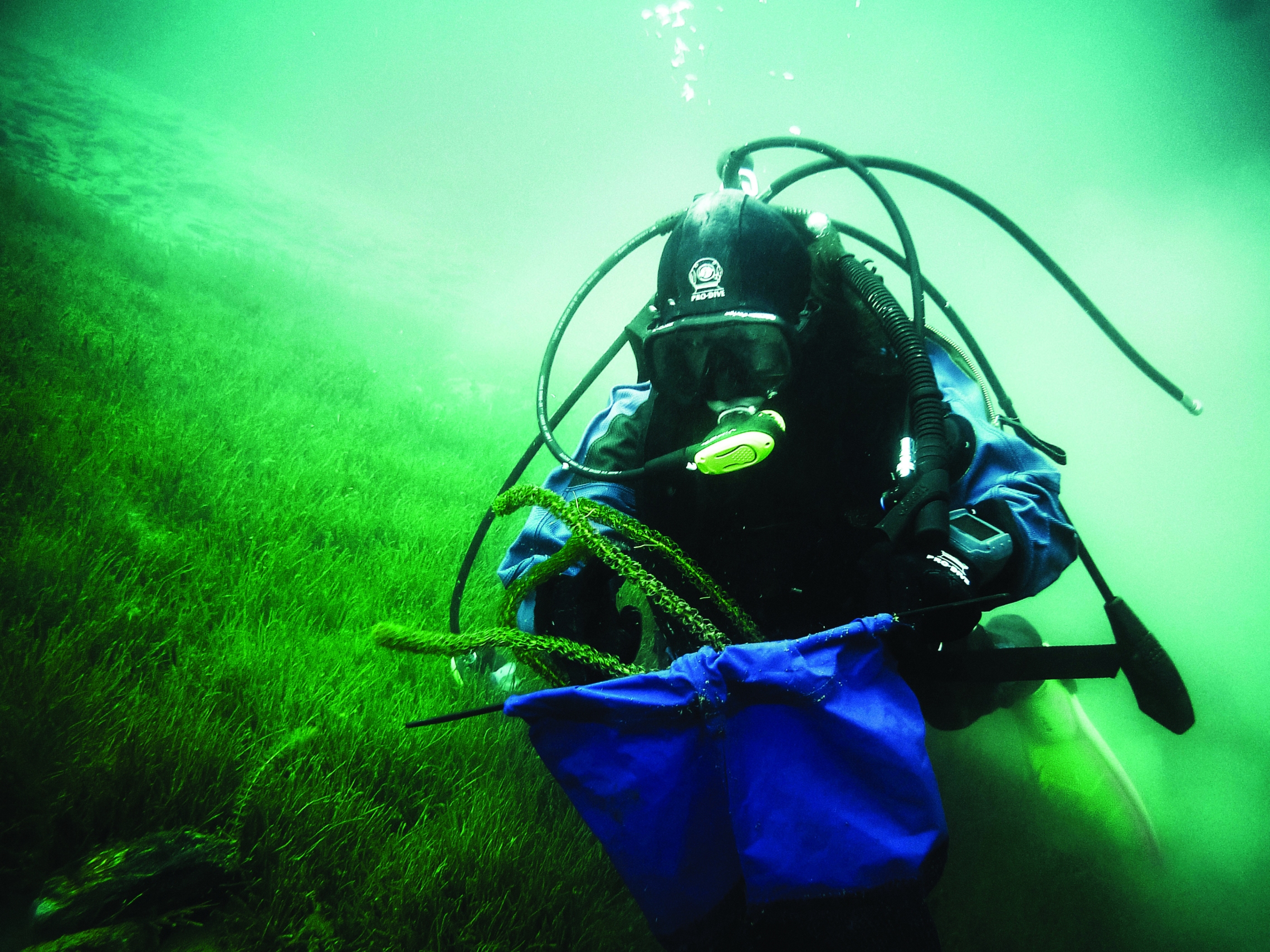 Honing the weapons against water weeds, a diver observes the behaviour of a gel additive that can be added to aquatic herbicides to improve their placement.