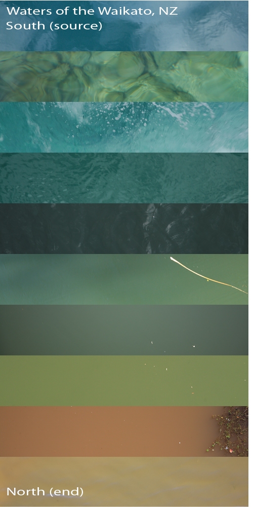 The quality of the river water varies considerably across the catchment. This image shows the colours of the Waikato River as it travels from its source in the south (top of image) downstream, including a Waikato stream and lakes at the bottom of the image. Note how the water starts off very clear, but becomes increasingly murky as it winds north. Credit: David Roper, NIWA