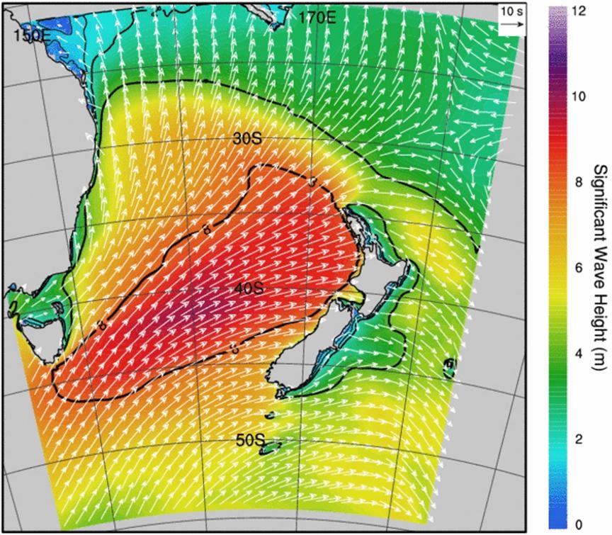 Figure 2: Wave conditions forecast for 0600 NZST on the 18th of September, from the New Zealand regional wave forecast.