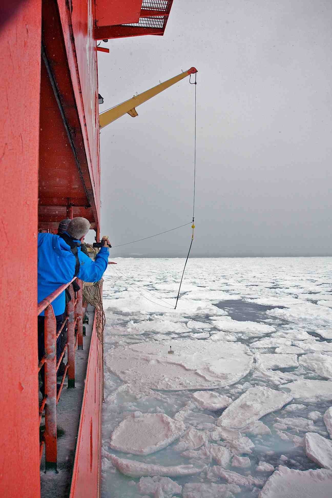 A wave sensor buoy sits on sea ice in the Southern Ocean.