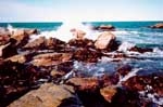 Waves, and the sand and mud they stir up, strongly affect the settlement and viability of plants along coasts and in estuaries. Kelp can survive in high wave-energy coastal settings such as this, where it is the dominant plant.