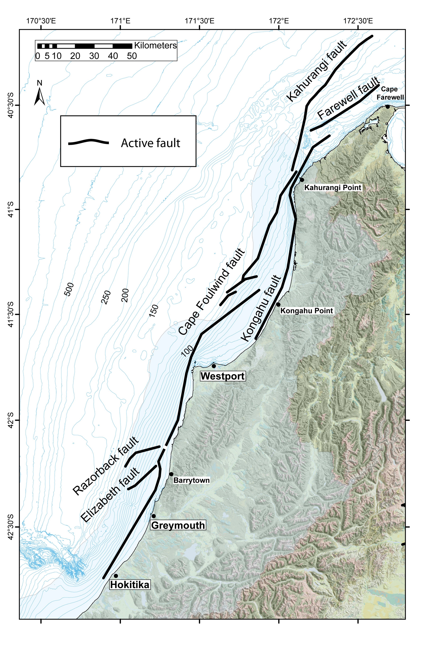 Ten marine faults lie in the 320km between Cape Farewell and Hokitika which are parallel to the coast and within 30km of the shore.