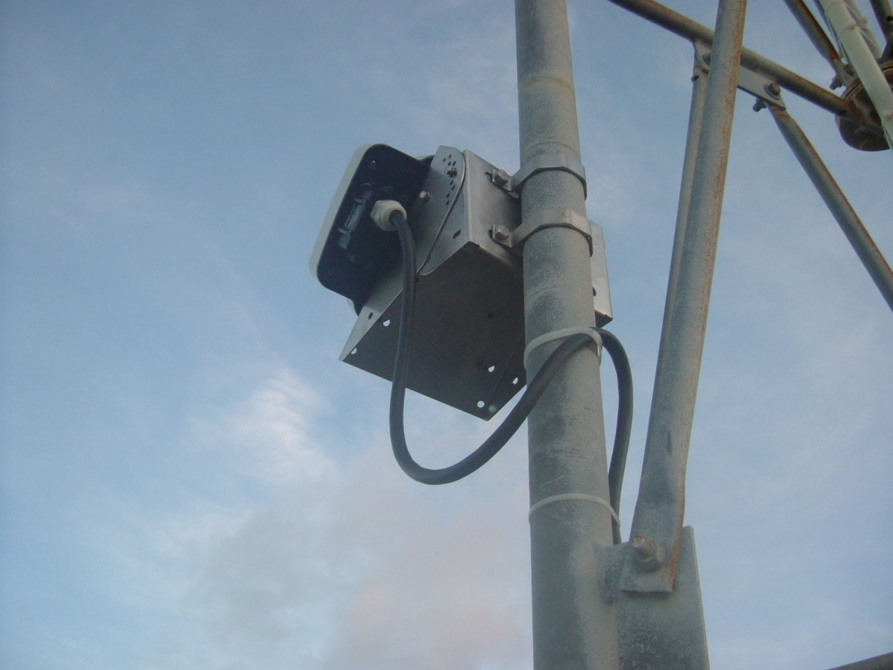 BGAN Satellite aerial mounted on the side of a mast facing a geostationary satellite. Photo Andrew Harper (NIWA)
