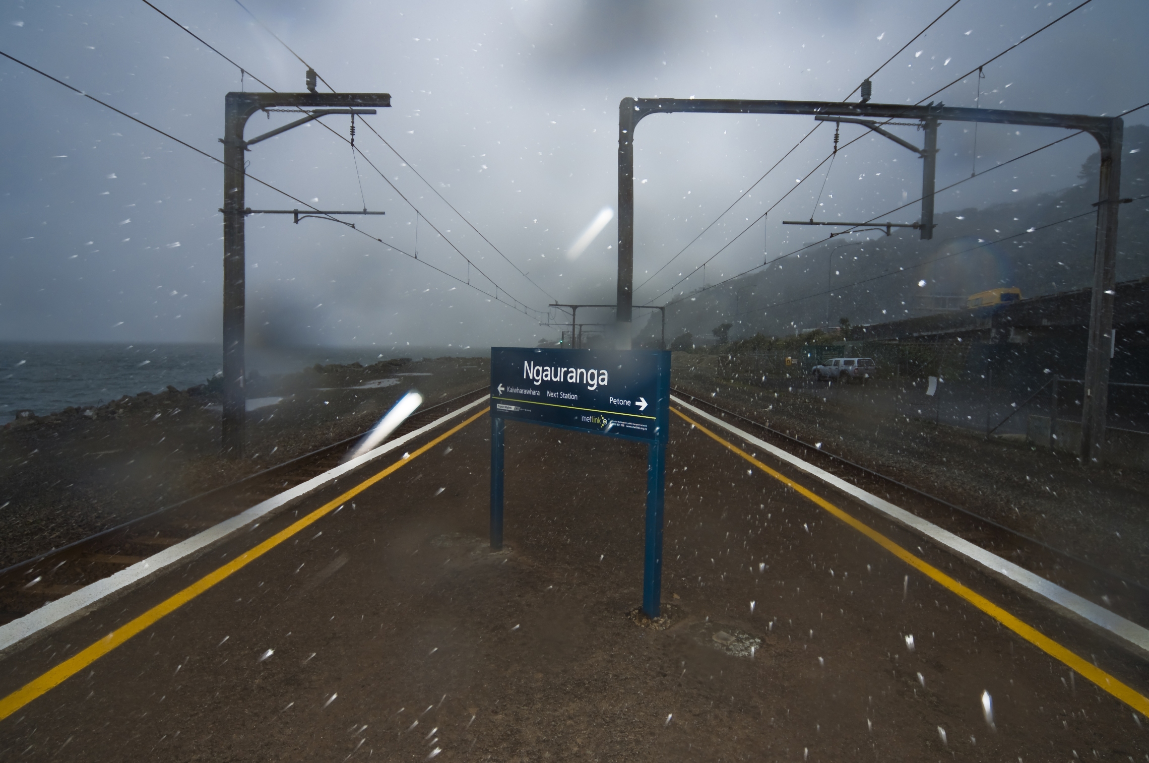 Snow falling at sea level, Ngauranga train station, Wellington. Photo taken by Dave Allen in August 2011.