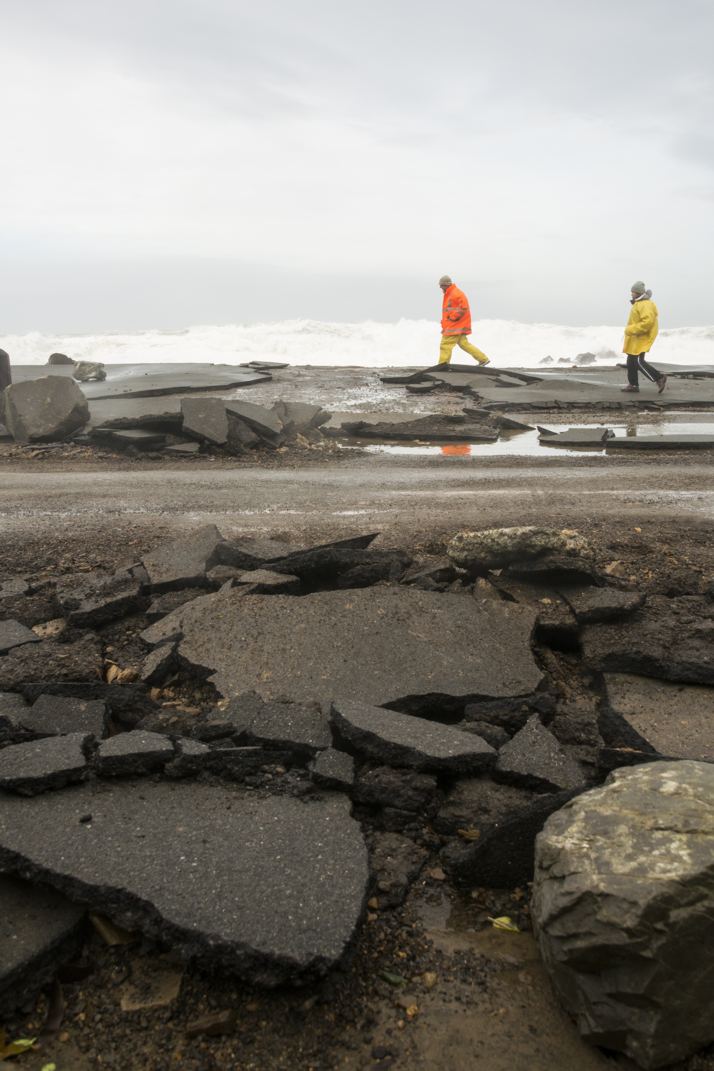 Damage to sea wall, carpark and road along the Esplanade, Owhiro Bay. Photo taken by Dave Allen on 21 June 2013.