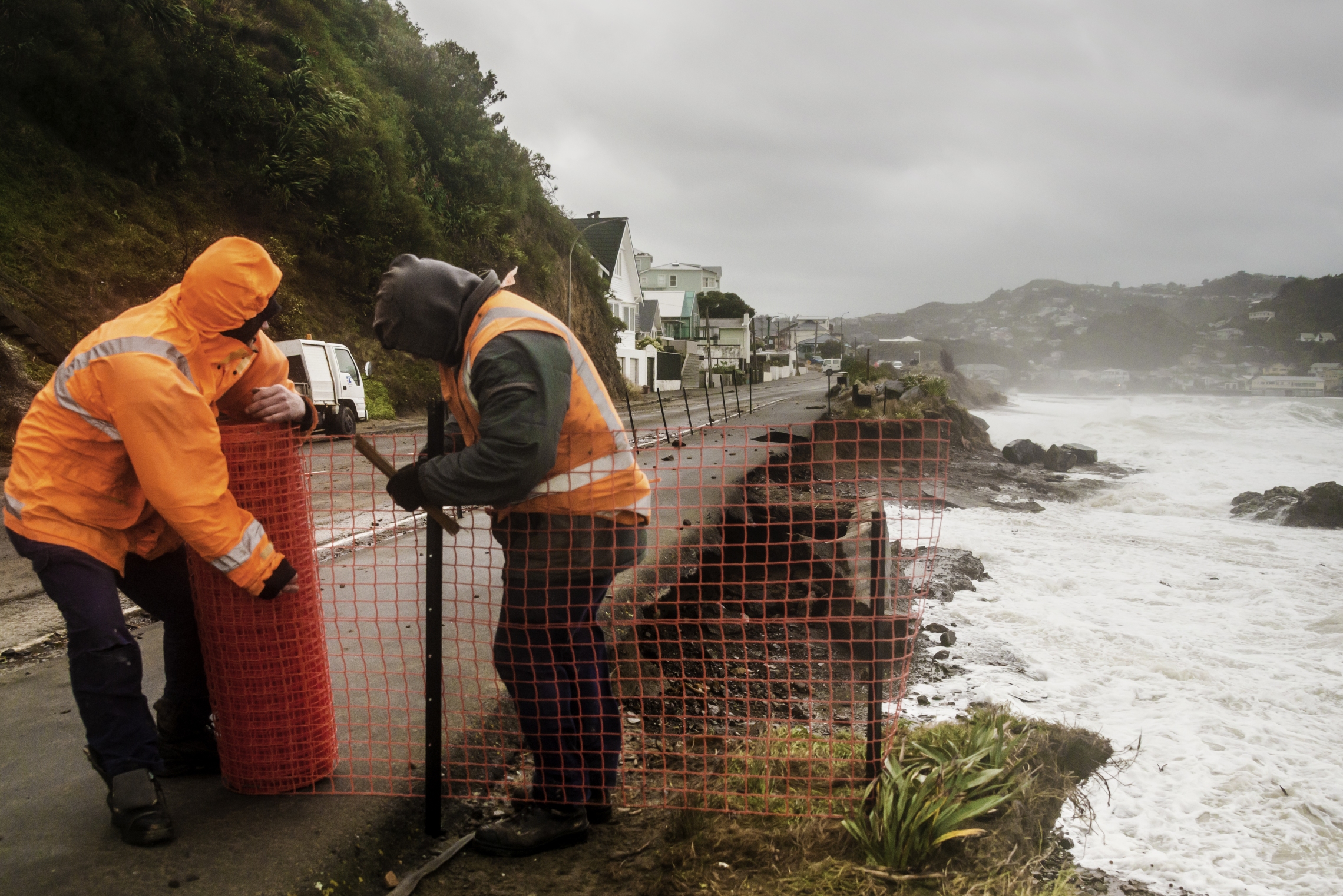 Council contractors construct a safety barrier around a footpath which has been undercut by waves at Island Bay, Wellington. Photo by Dave Allen on 21 June 2013.