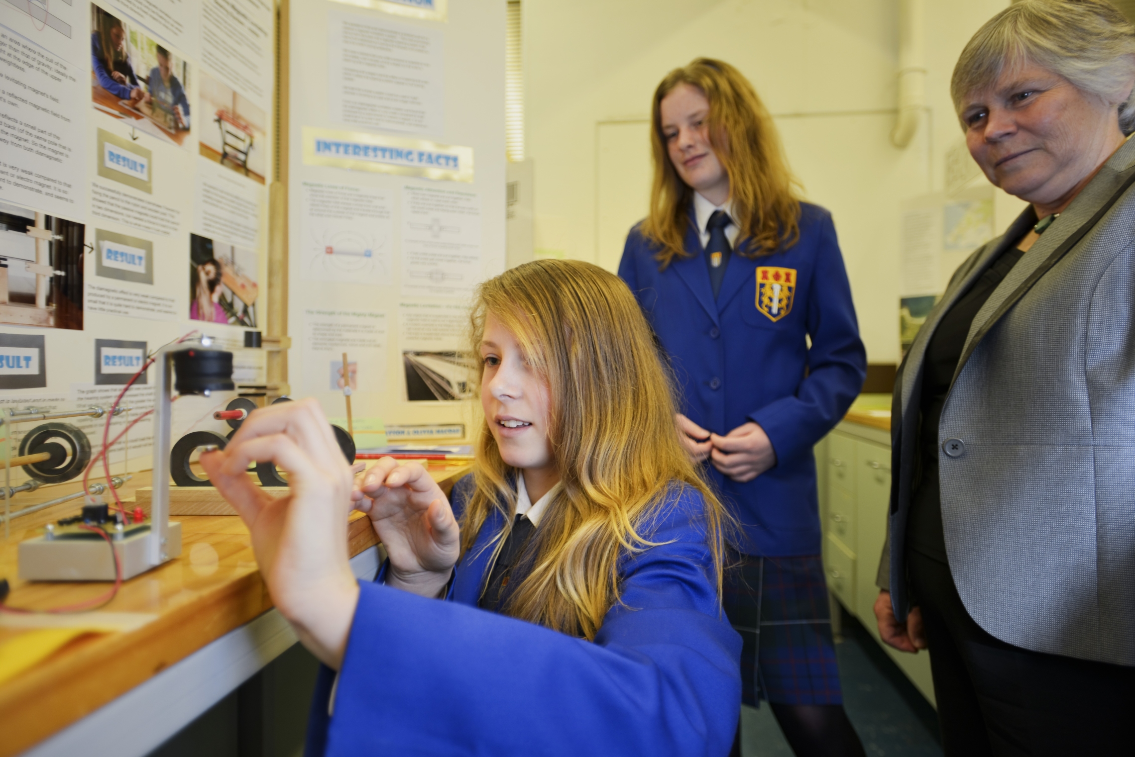 NIWA Wellington Science and Technology Fair 2012 competitors Danielle Watson, left, and Olivia Macrae, centre, discuss their entry with NIWA scientist Dr Julie Hall.