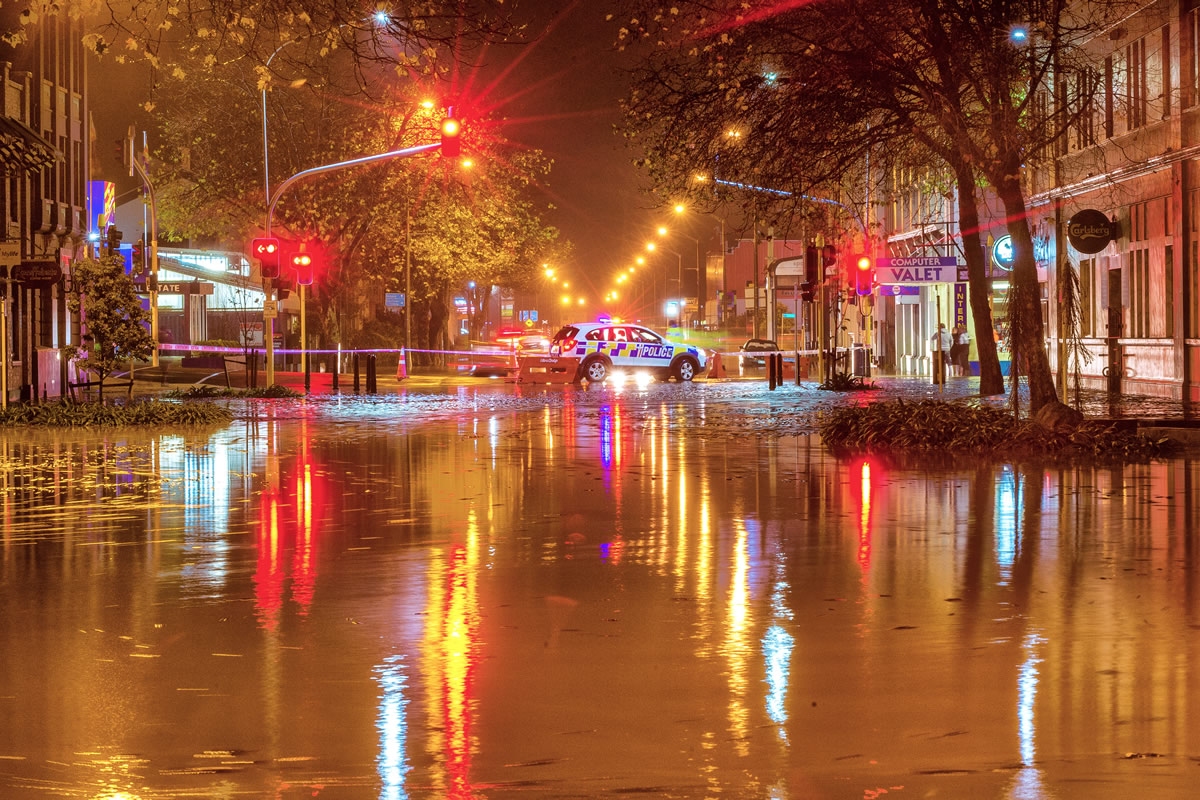 Police redirect traffic away from Whanganui's CBD as flood waters rise after record rainfall in June 2015.
