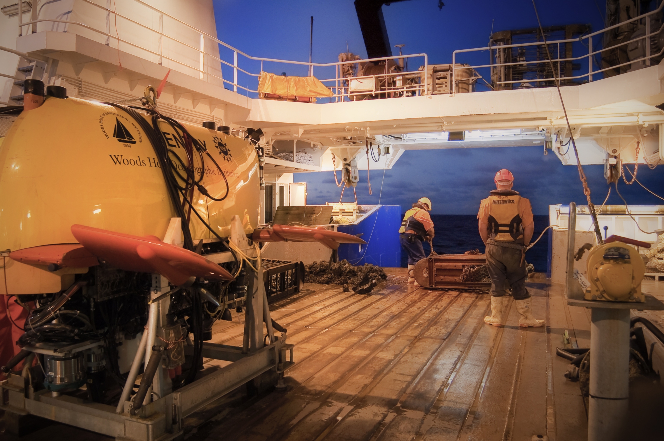 Barry Fleming (left) and Michael Michie (right) ready the seamount sled for re-deployment after it has been emptied on deck (rocks on left). The Woods Hole Oceanographic Institution 'Sentry' is in the foregorund. Photo taken by Kareen Schnabel.