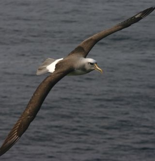 With a wingspan of more than two metres, a Buller's albatross (Thalassarche bulleri) soars across the Southern Ocean in search of food. NIWA scientists are tracking albatrosses to assess their overlap with fishing vessels.
