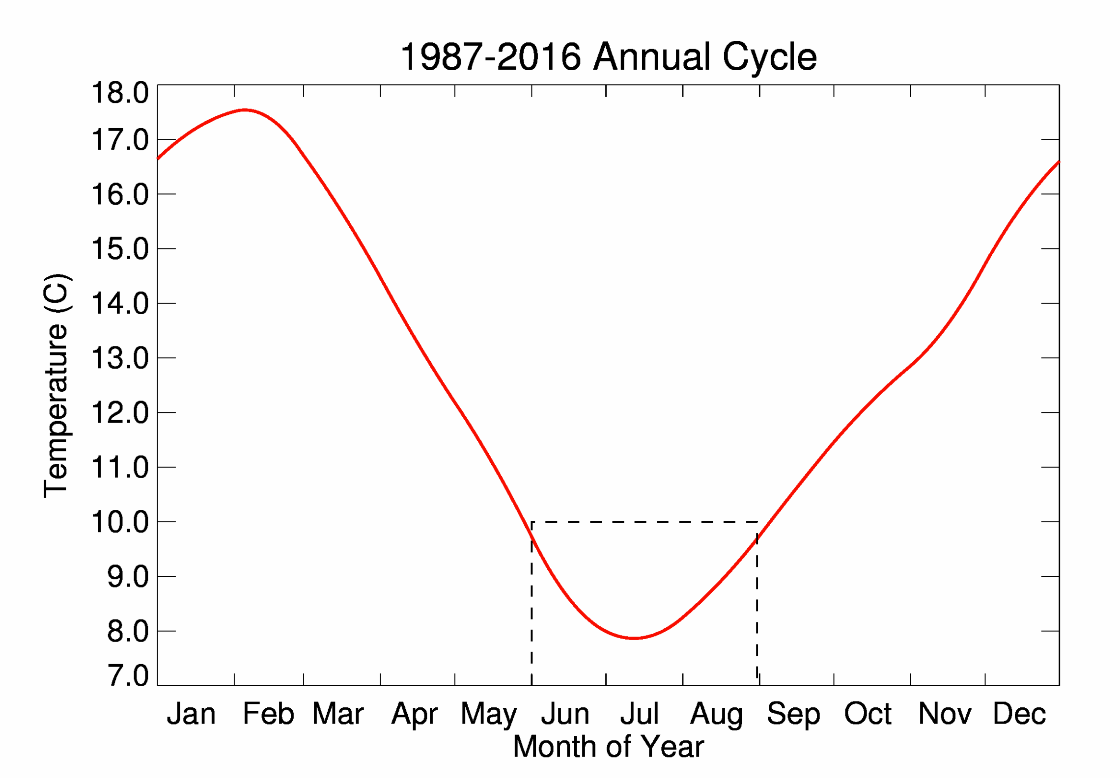 A smooth annual cycle of daily temperatures fitted to the monthly temperatures from NIWA’s 7-station series, for the period 1987-2016. The dashed box outlines the standard winter period, June 1 to August 31. (Note that the tick marks on the x-axis denote the 1stday of each month).