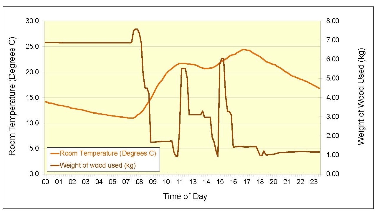 <p>Time trace of room temperature and weight of wood fuel used</p>