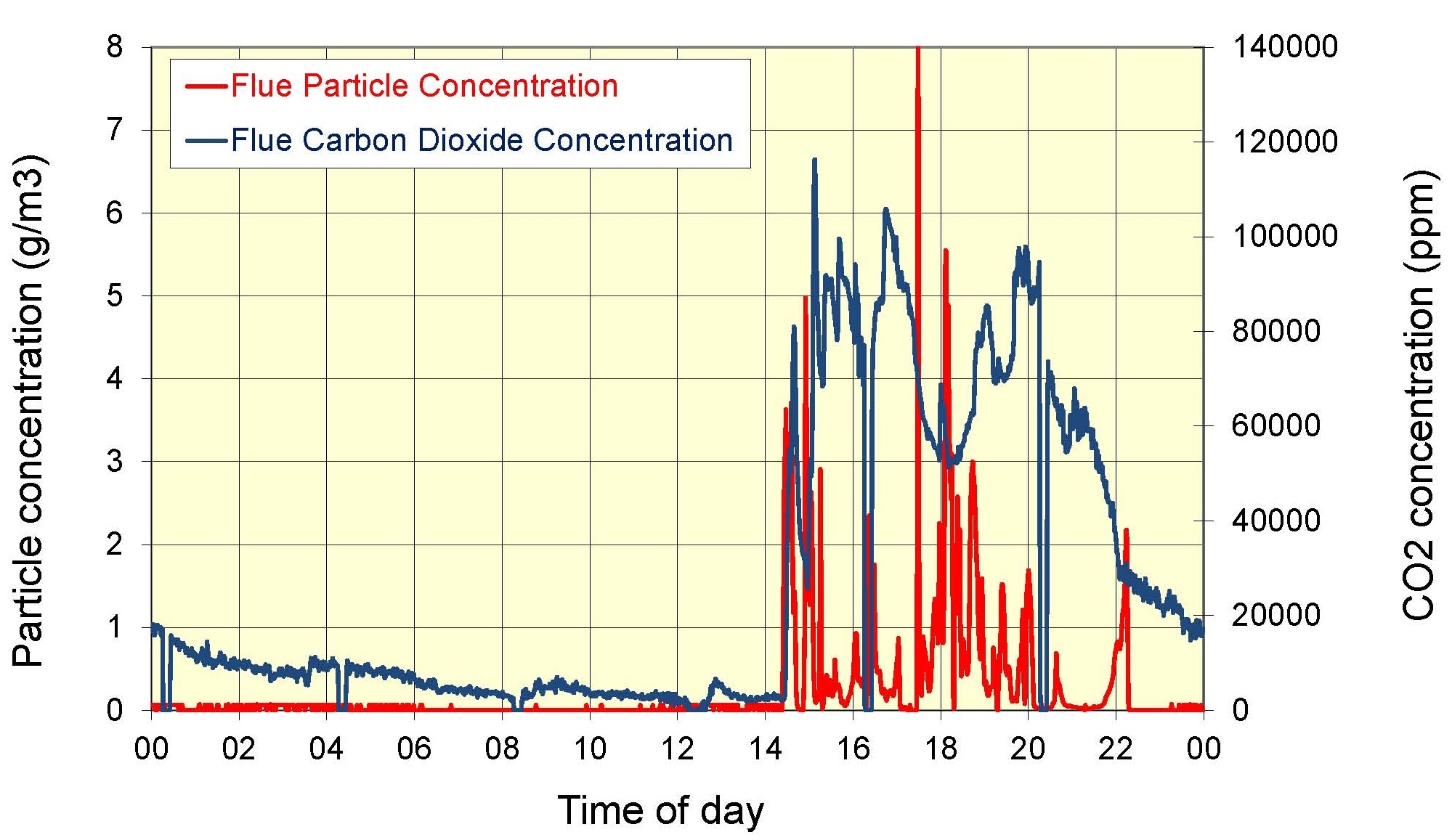 <p>Time trace of particulates and CO2 concentrations in the flue gas</p>