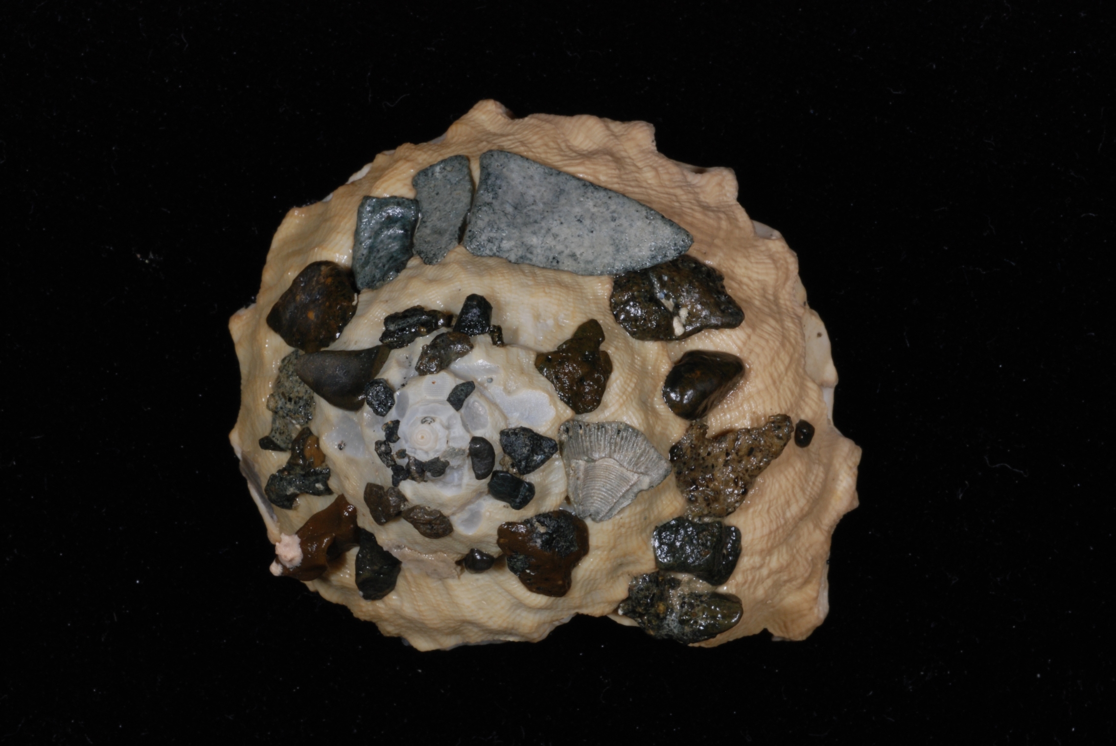 Small stones and a barnacle plate from the local substrate are the shell decoration and camouflage of choice for this specimen of Xenophora (Xenophora) neozelanica neozelanica collected from 142 m, in the Bay of Islands.