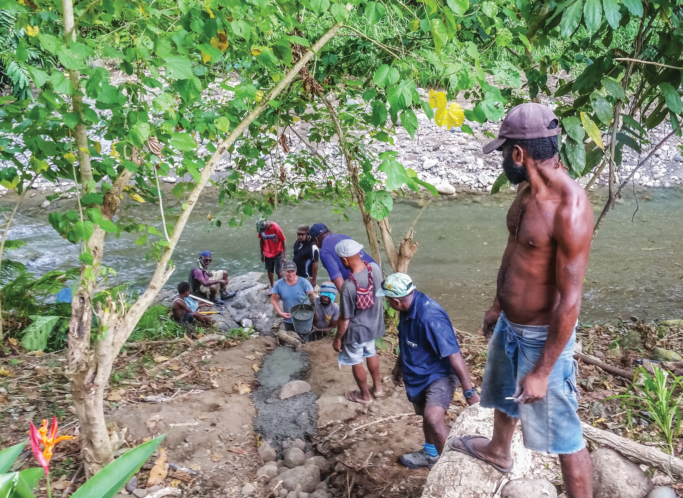 Environmental Monitoring Technician Alec Dempster and villagers install a water level gauge alongside Yalu River on the outskirts of Lae City.