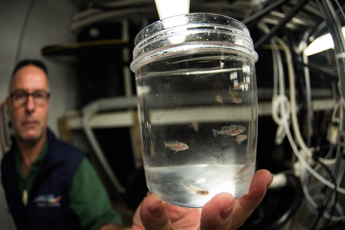 Yann Gublin and larval snapper at Bream Bay, NIWA’s Northland Marine Research Centre.