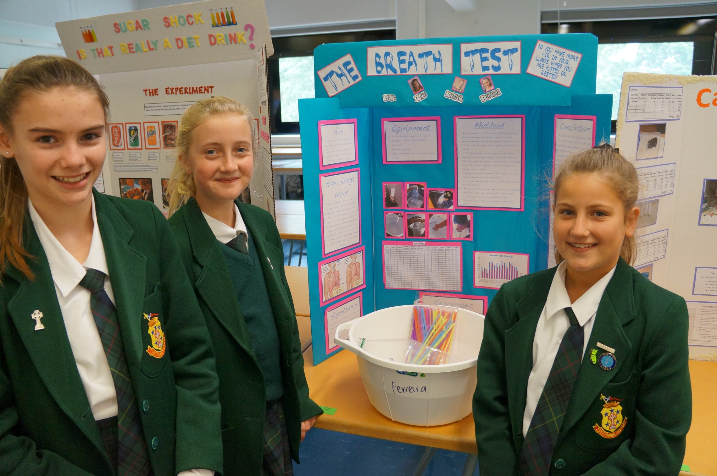 Zoe Ferreira, Mackenzie Campbell and Phoebe Evans with their project testing lung capacity.