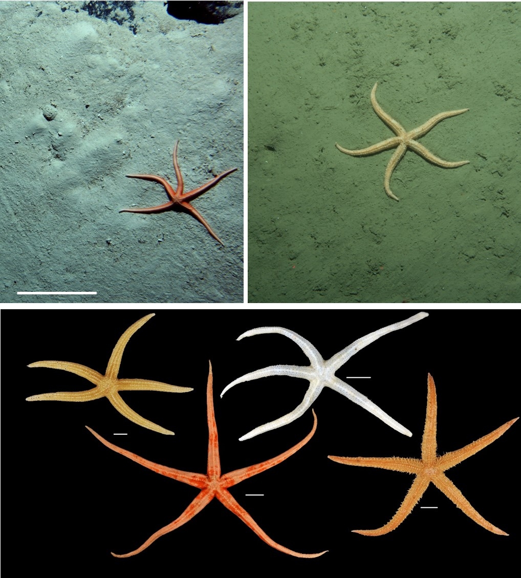Top panel: DTIS NIWA/ Vulnerable Deepsea Communities voyage TAN1402 (scale = 20 cm). Bottom panel: Anderson et al. (2011) Echinodermata chapter in “A guide to common deepsea invertebrates in New Zealand waters, 3rd edition (scale = 2 cm).